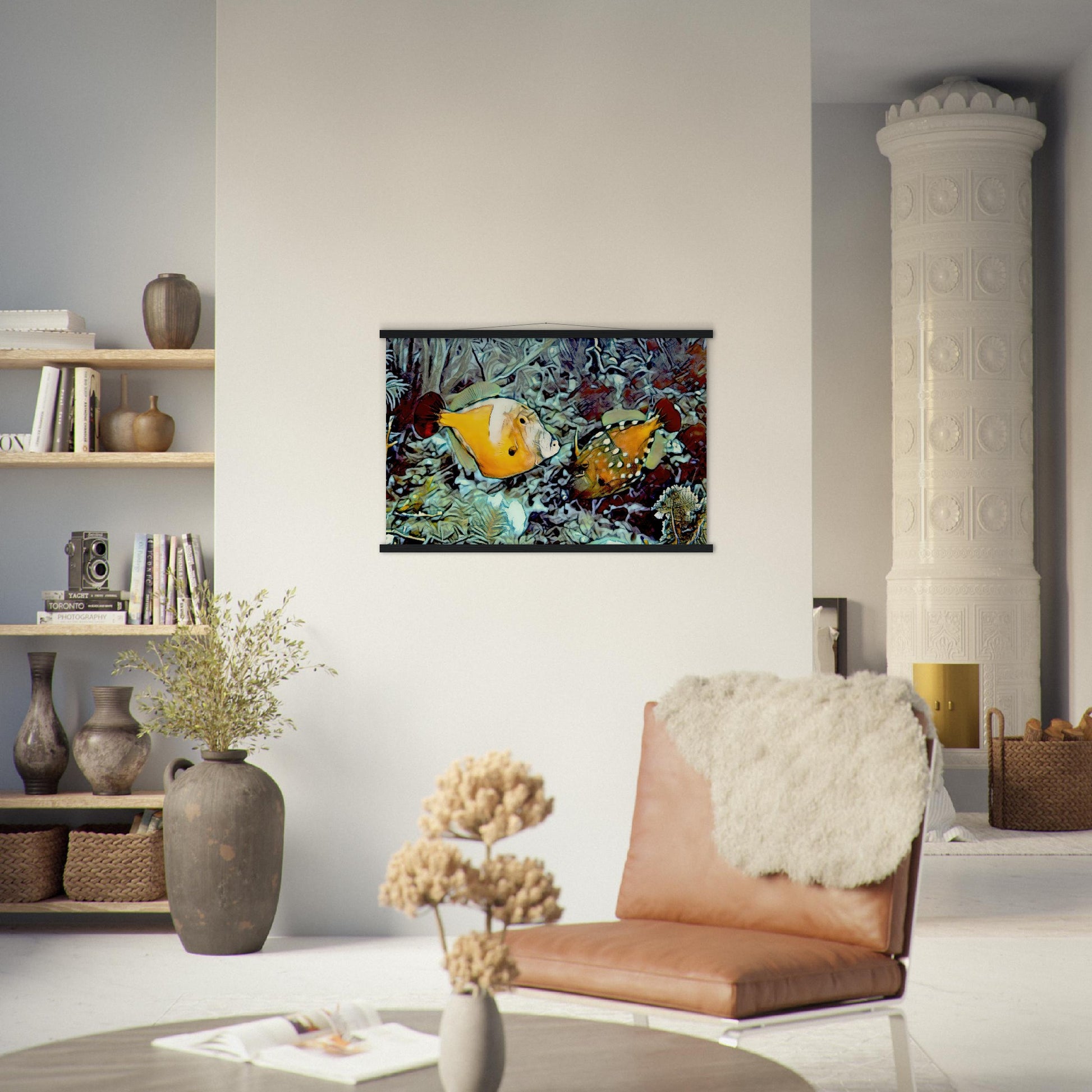 Our minimalist wooden hangers are made with four magnetic wooden dowels, two that clamp to the top of your print and two that clamp to the bottom to give a vintage look and feel. The poster is made on our master's edition, archival museum-quality paper. It is off-white, uncoated, and the superior choice for art enthusiasts who appreciate world-class quality to enjoy artworks most luxuriously.